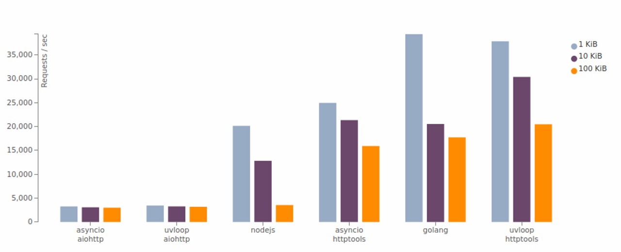 - uvloop ๊ธฐ๋ฐ asyncio์ ์ฑ๋ฅ์ Go ํ๋ก๊ทธ๋จ ์ฑ๋ฅ์ ๊ฐ๊น๋ค.